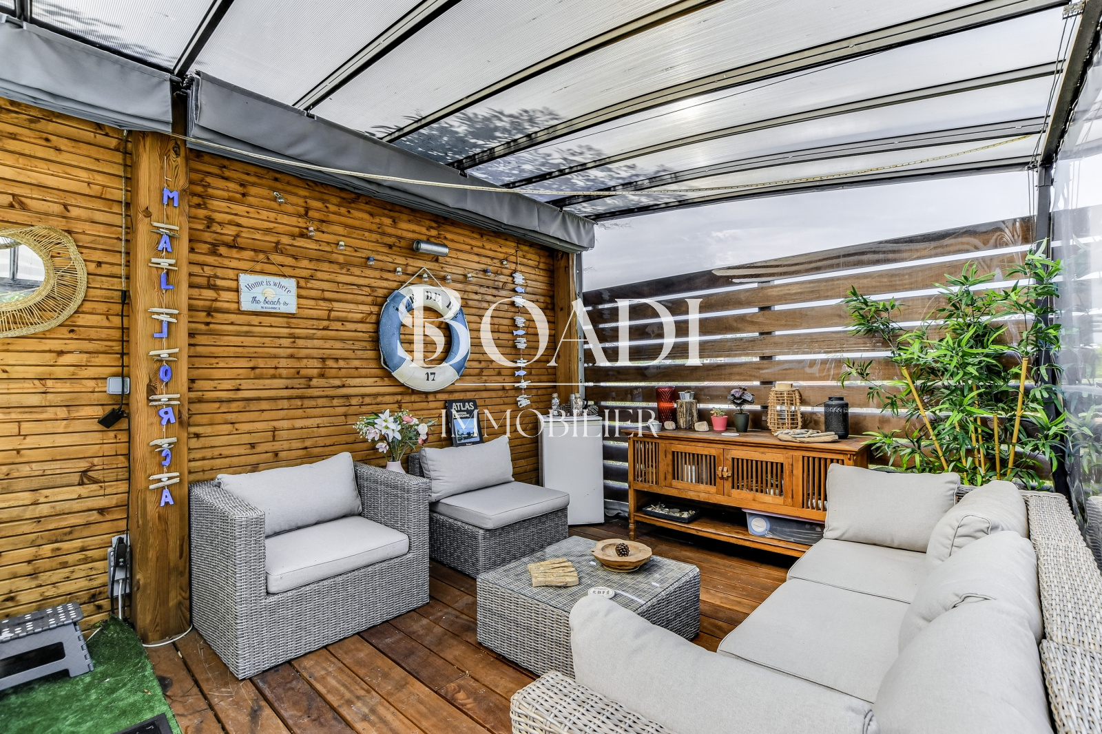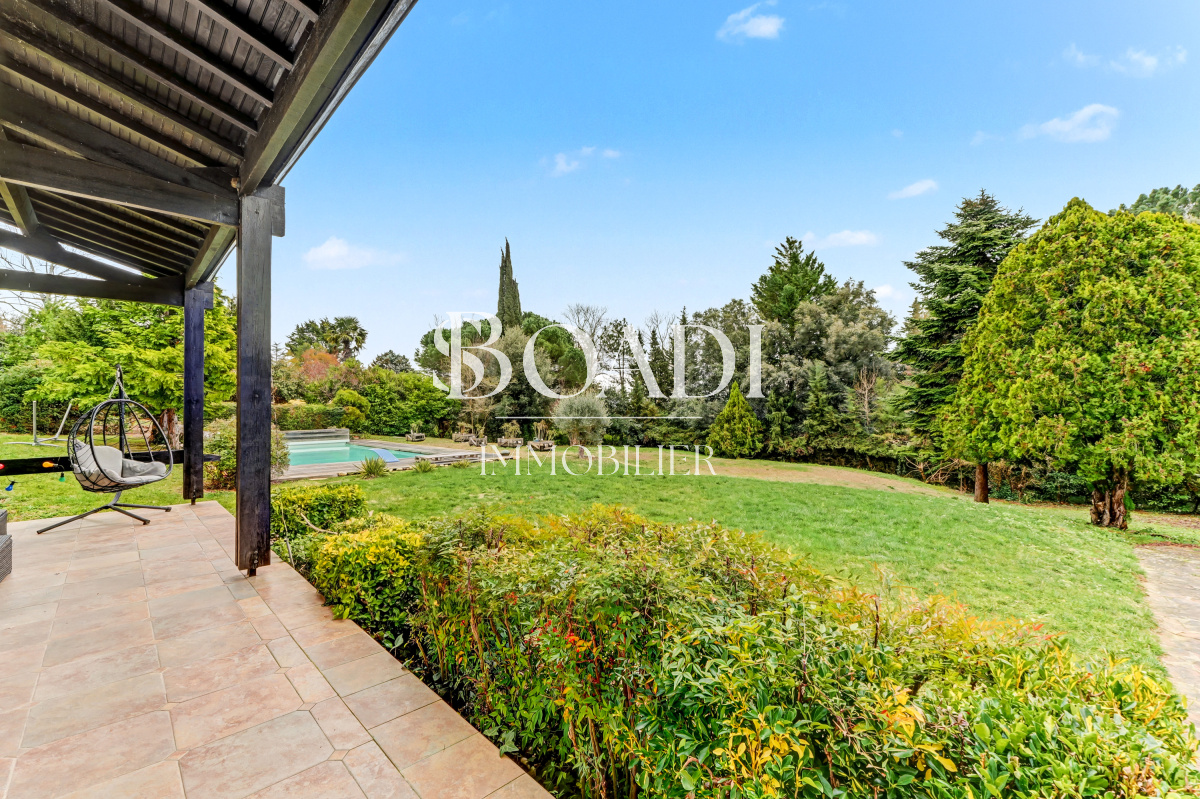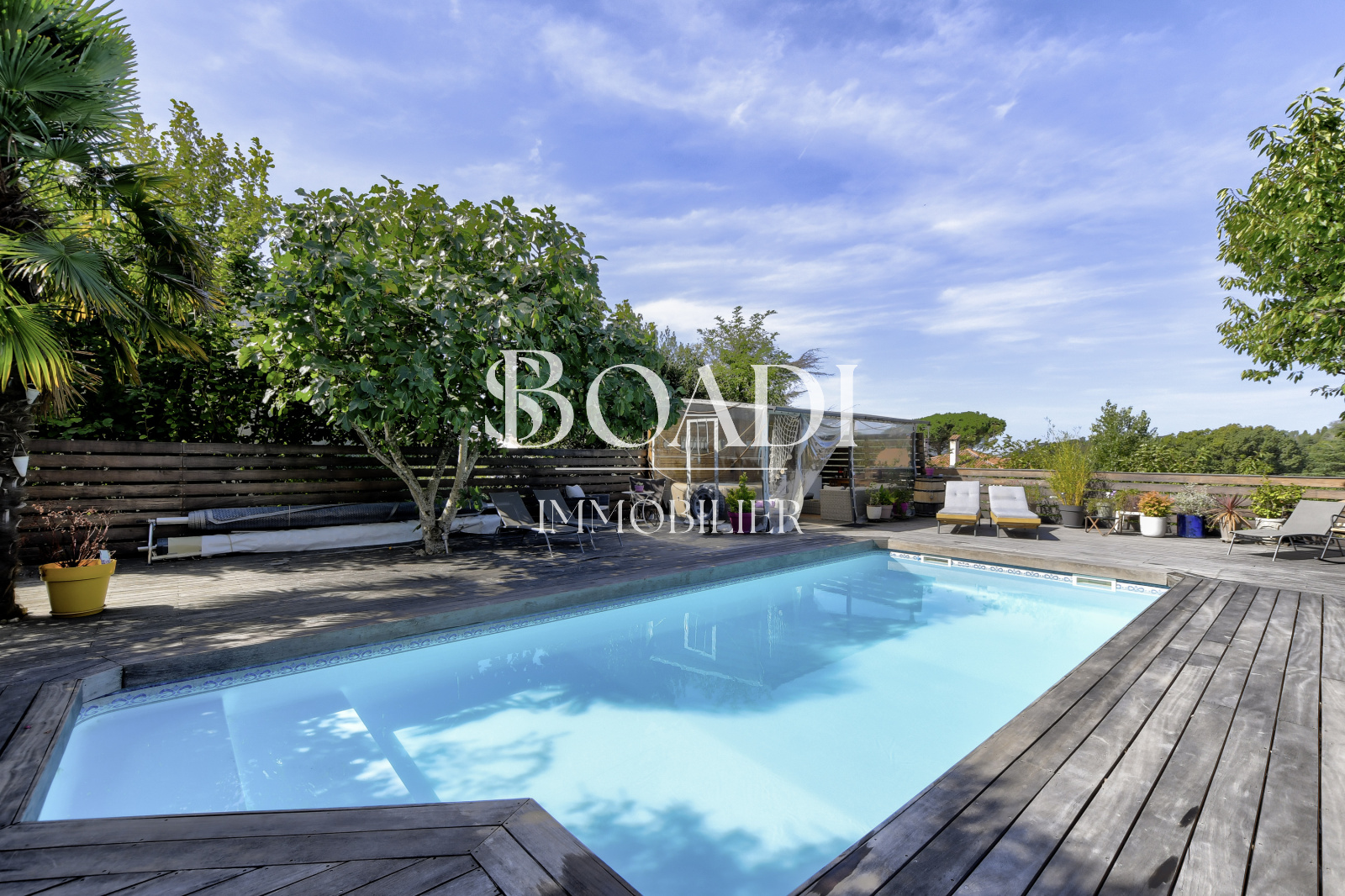 À l’extérieur, le jardin paysager de 875 m² est un véritable écrin de verdure, pensé pour profiter pleinement de chaque saison. Piscine, terrasses en bois, pergolas, espaces ombragés et boulodrome composent un cadre de vie aussi esthétique que convivial.